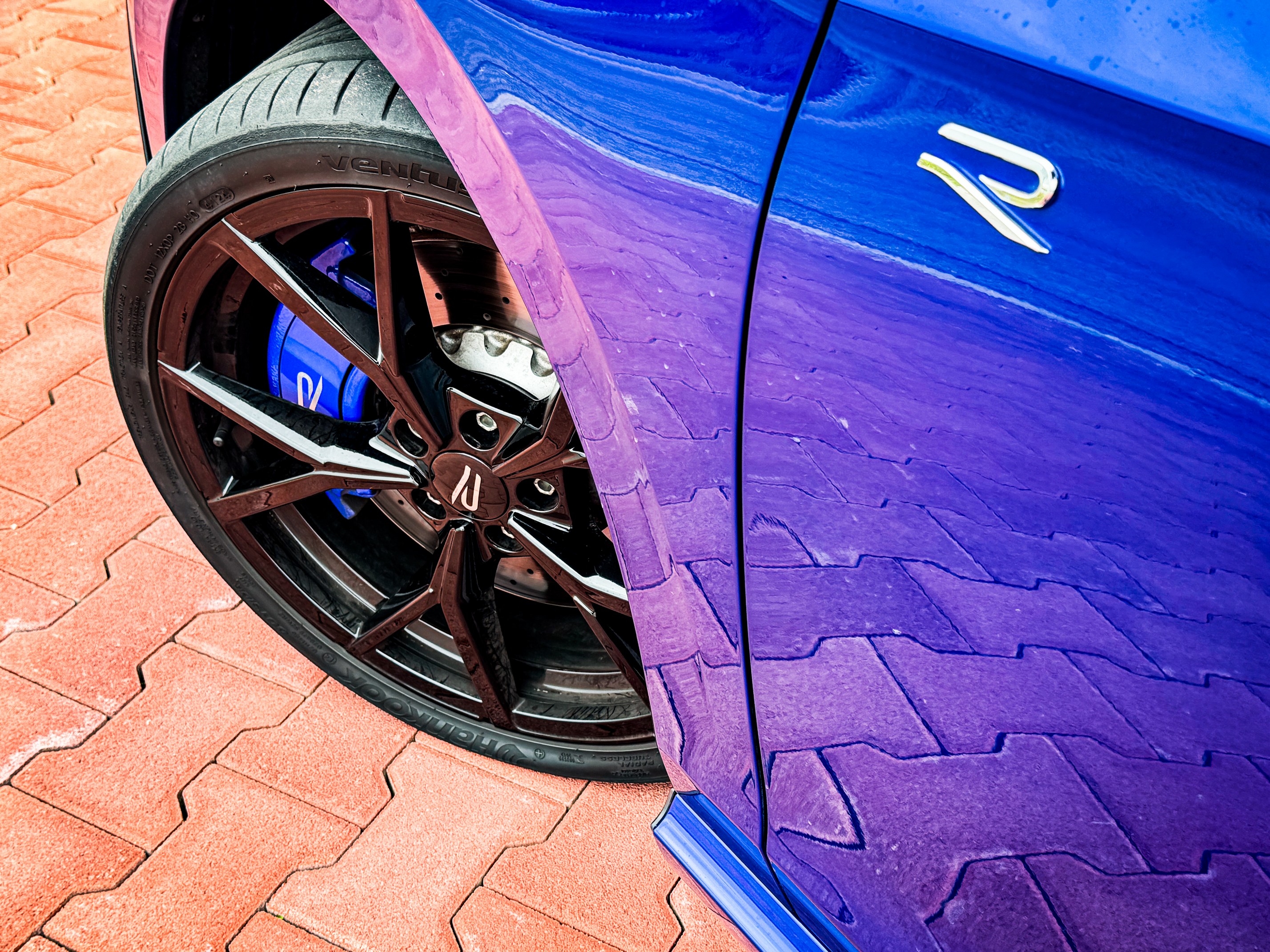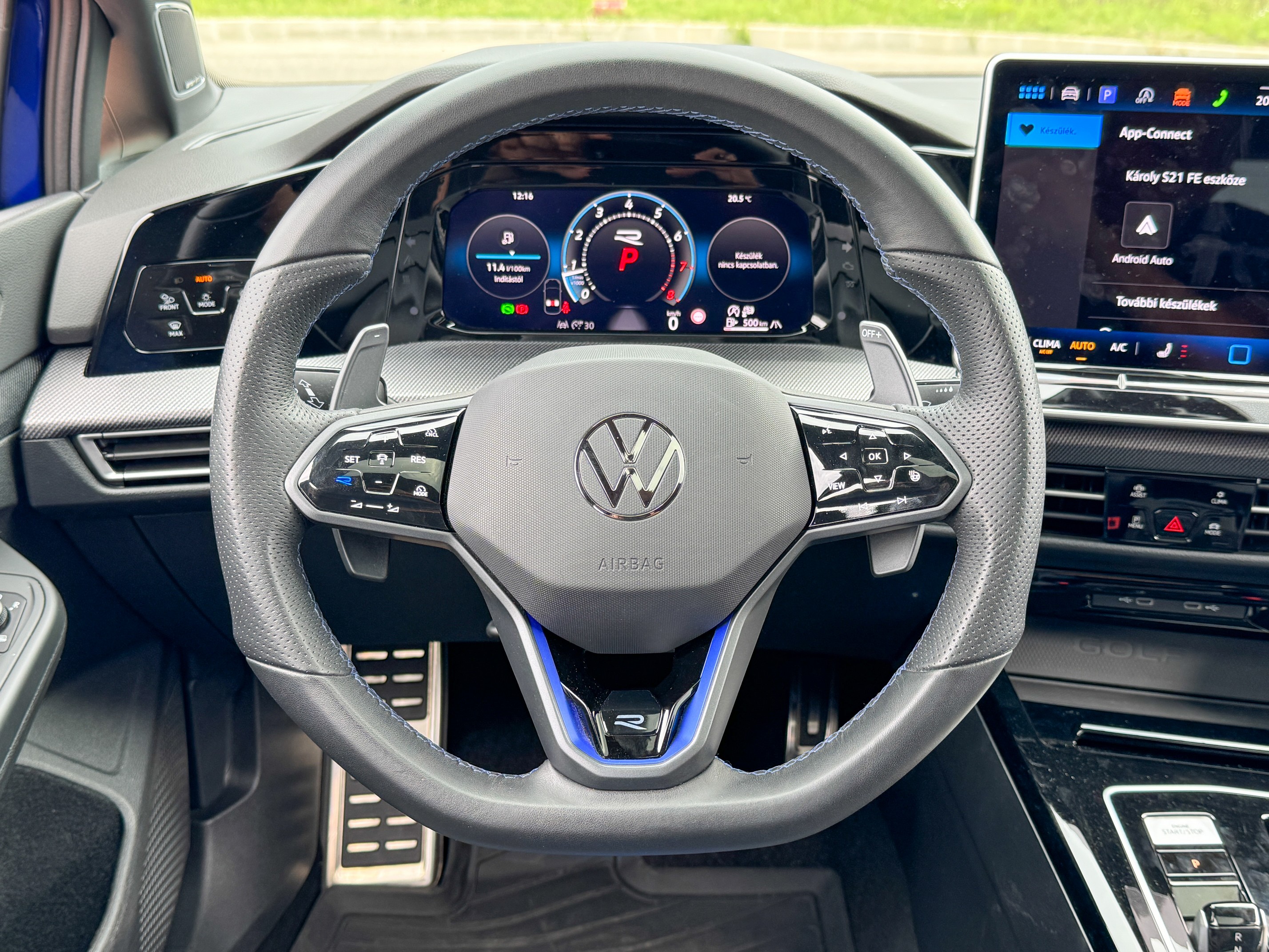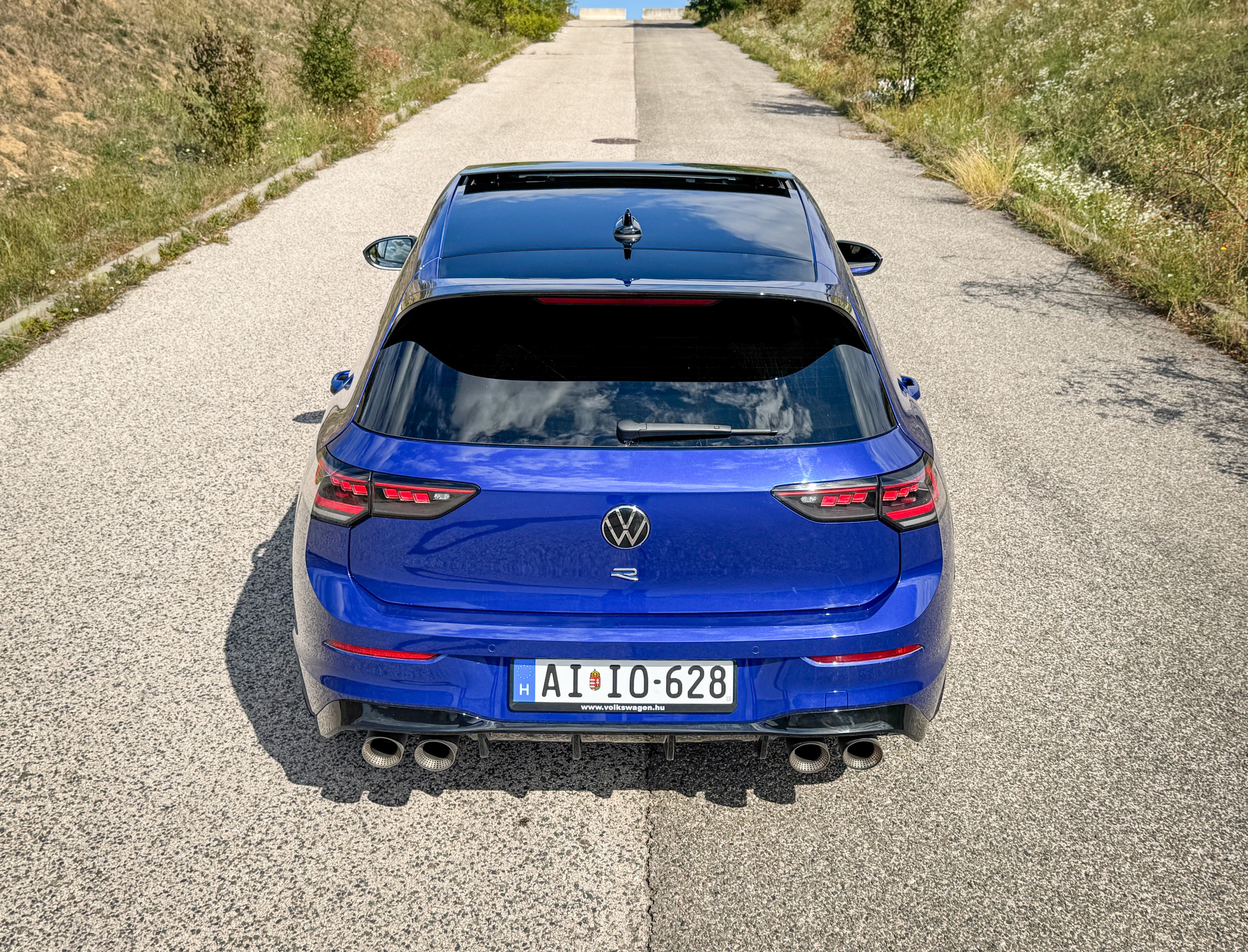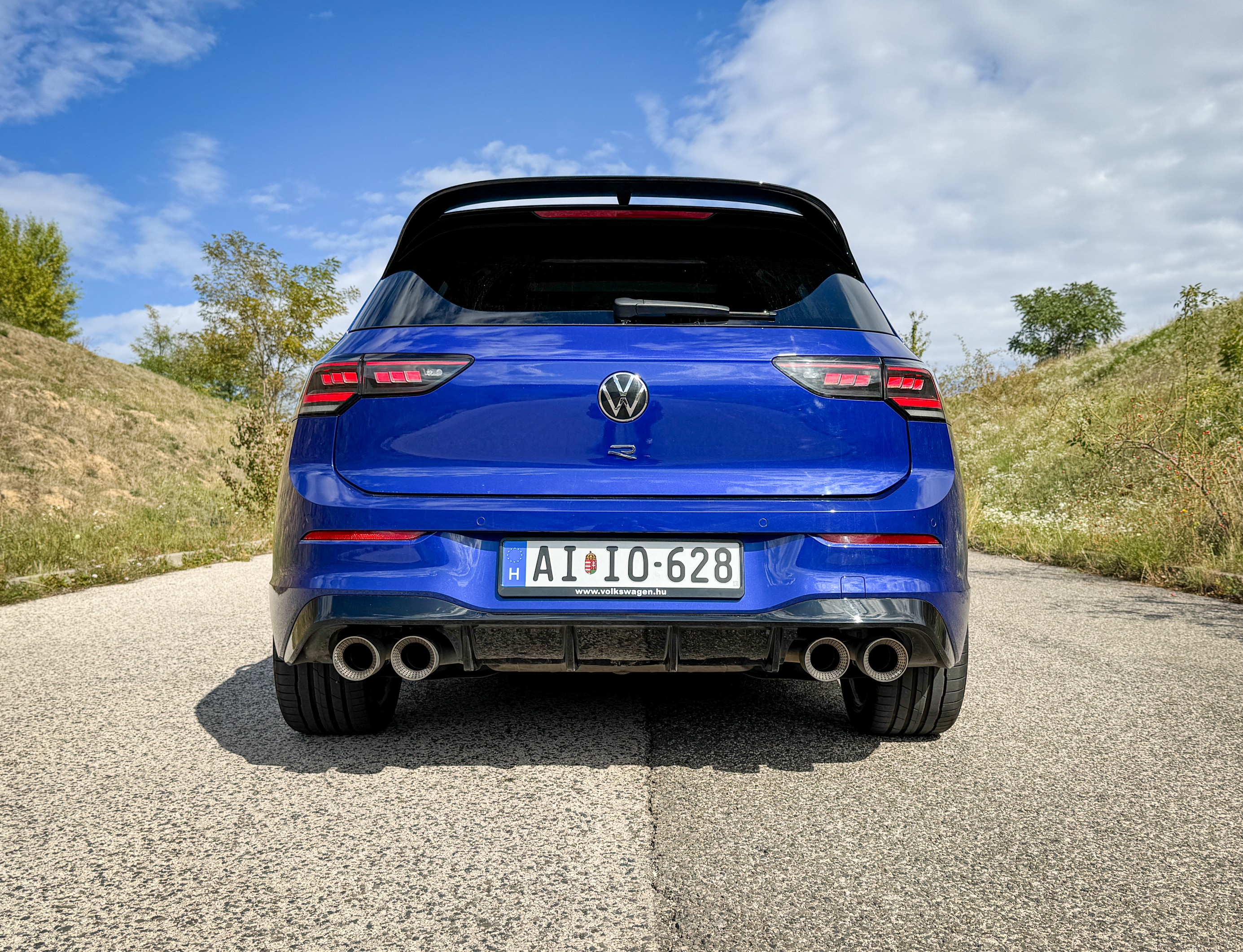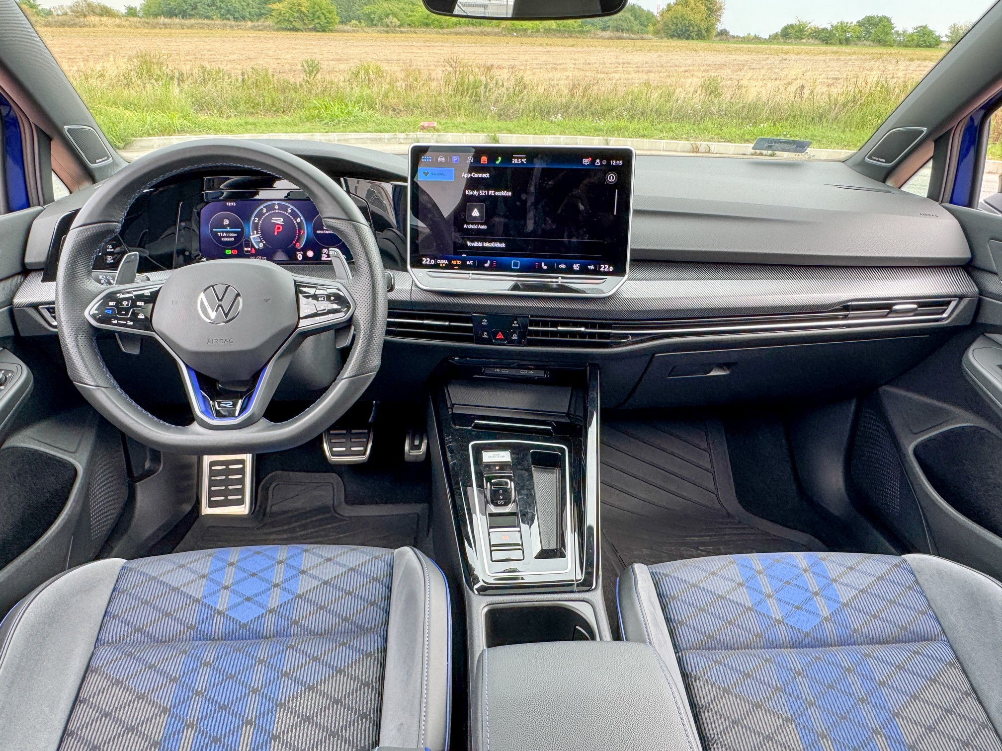 Végül, de nem utolsósorban, a belső kialakítás is tökéletesen tükrözi a modell sportos jellegét. Az egyedi kék R-es logóval díszített sportülések, a perforált bőr kormány, a szénszálas betétek és a kék ambient világítás egyaránt igazi verseny szellemet idéznek. Az R-specifikus digitális műszerfal és a központi érintőképernyő intuitív és modern kezelhetőséget biztosítanak. A korábbi Volkswagen konszern infotainment rendszereit ért kritikák mára a múlté: a tesztünk során minden óramű pontossággal működött és reagált, így a vezetésre koncentrálhatunk anélkül, hogy a technológia hátráltatna minket.