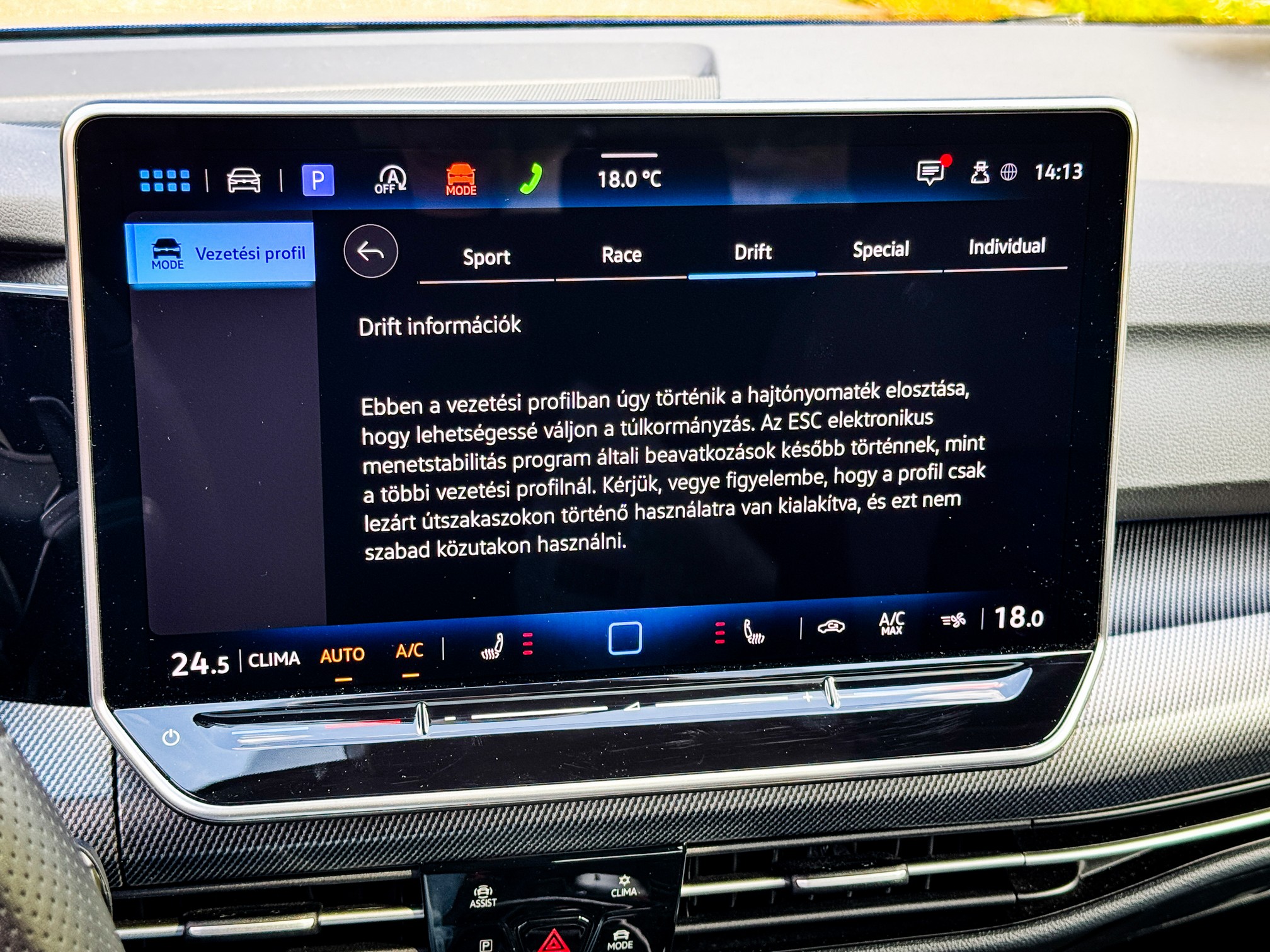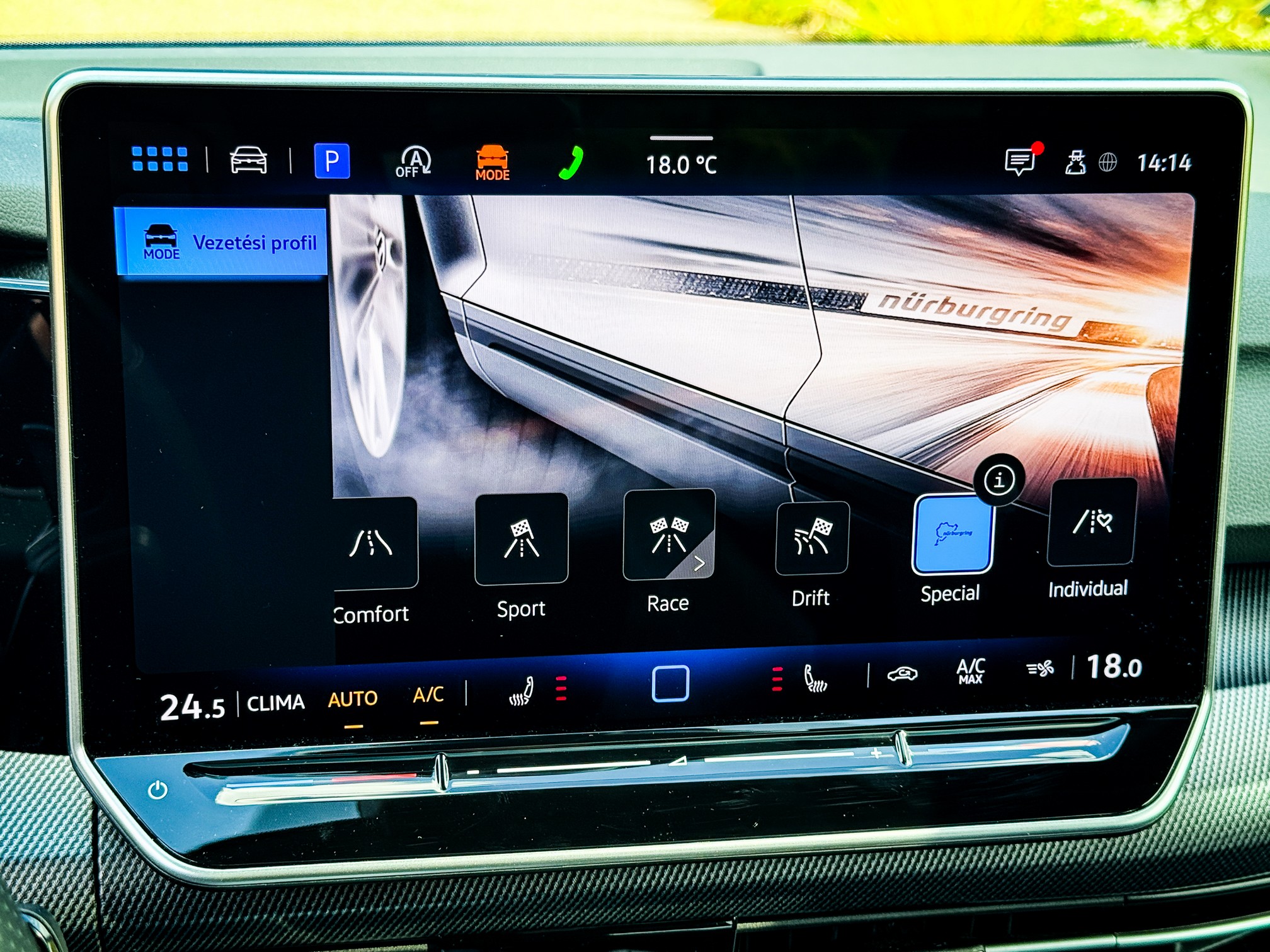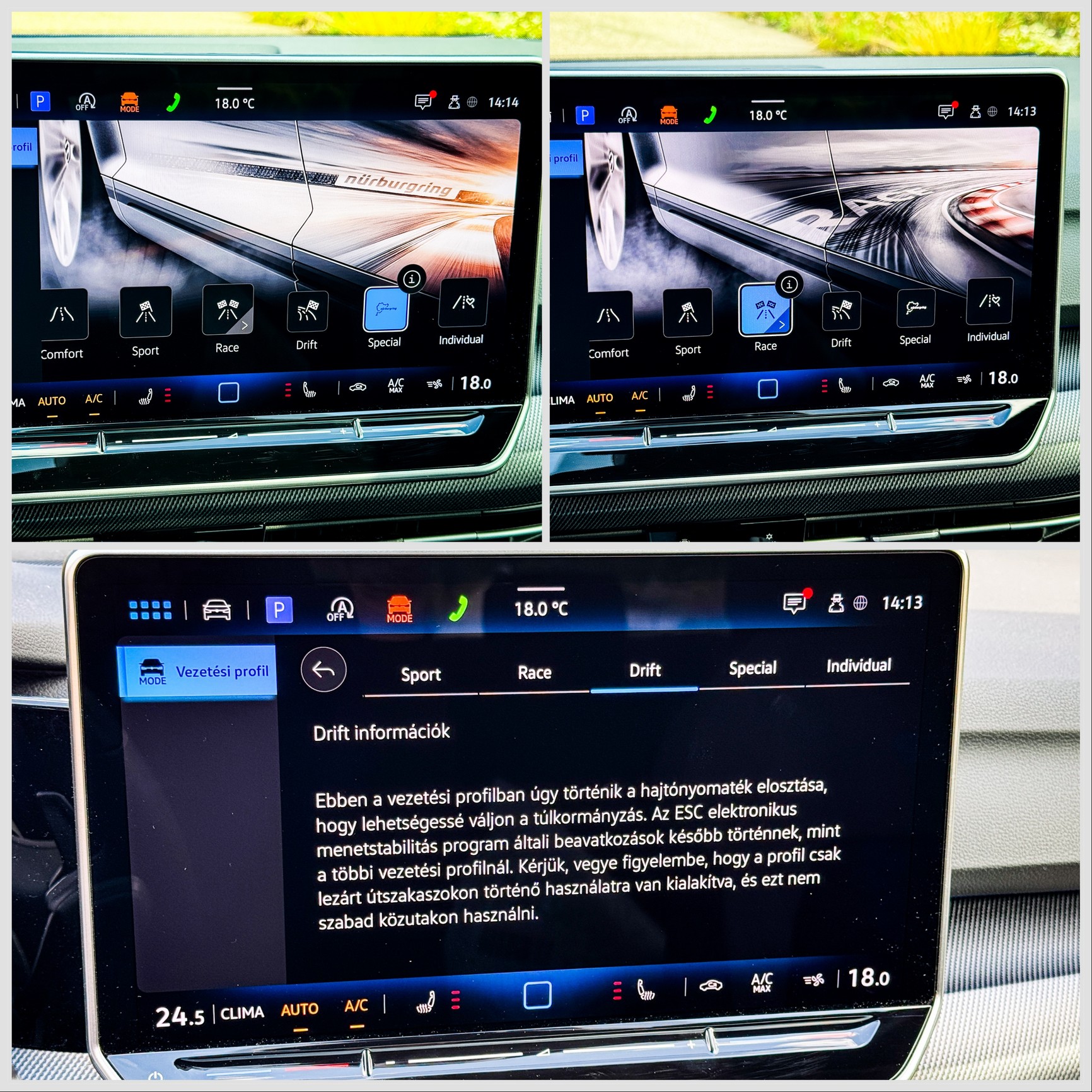 Igen, jól olvasod: drift mód egy Golfban? Ez a 21. század! Egyetlen gombnyomással a rendszer a hátsó tengelyre küld több erőt, így az autó kontrolláltan, látványos szögben képes driftelni, mindezt egy kompakt, ferdehátú modellben. A másik opció, a „Nürburgring” mód, amellyel a felfüggesztés, a motorvezérlés és a váltó beállításai a legendás Nordschleife versenypályához igazodnak, így maximális teljesítményt és jobb köridőket lehet elérni.