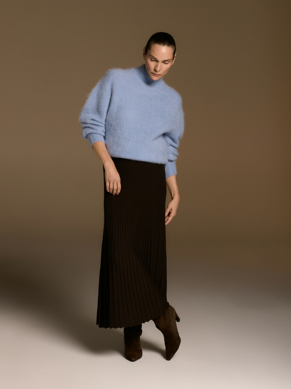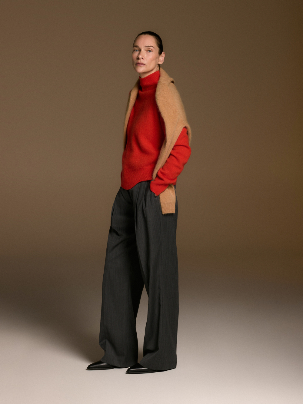 A szezon kulcs darabjai közé tartoznak a klasszikus gyapjú- és kasmír szövetkabátok, amelyek könnyűek, mégis melegek. Ezek mellett puha, karakteres textúrájú pulóverek is megjelennek: kockás minták, jacquard dizájnok és háromdimenziós virág motívumok teszik őket egyedivé, művészi hangulatot kölcsönöz az egész megjelenésnek. A színpalettát a bézs, a szürke és a fehér árnyalatai uralják, amelyeket elektromos kék, kobalt és csokoládébarna tónusok törnek meg.