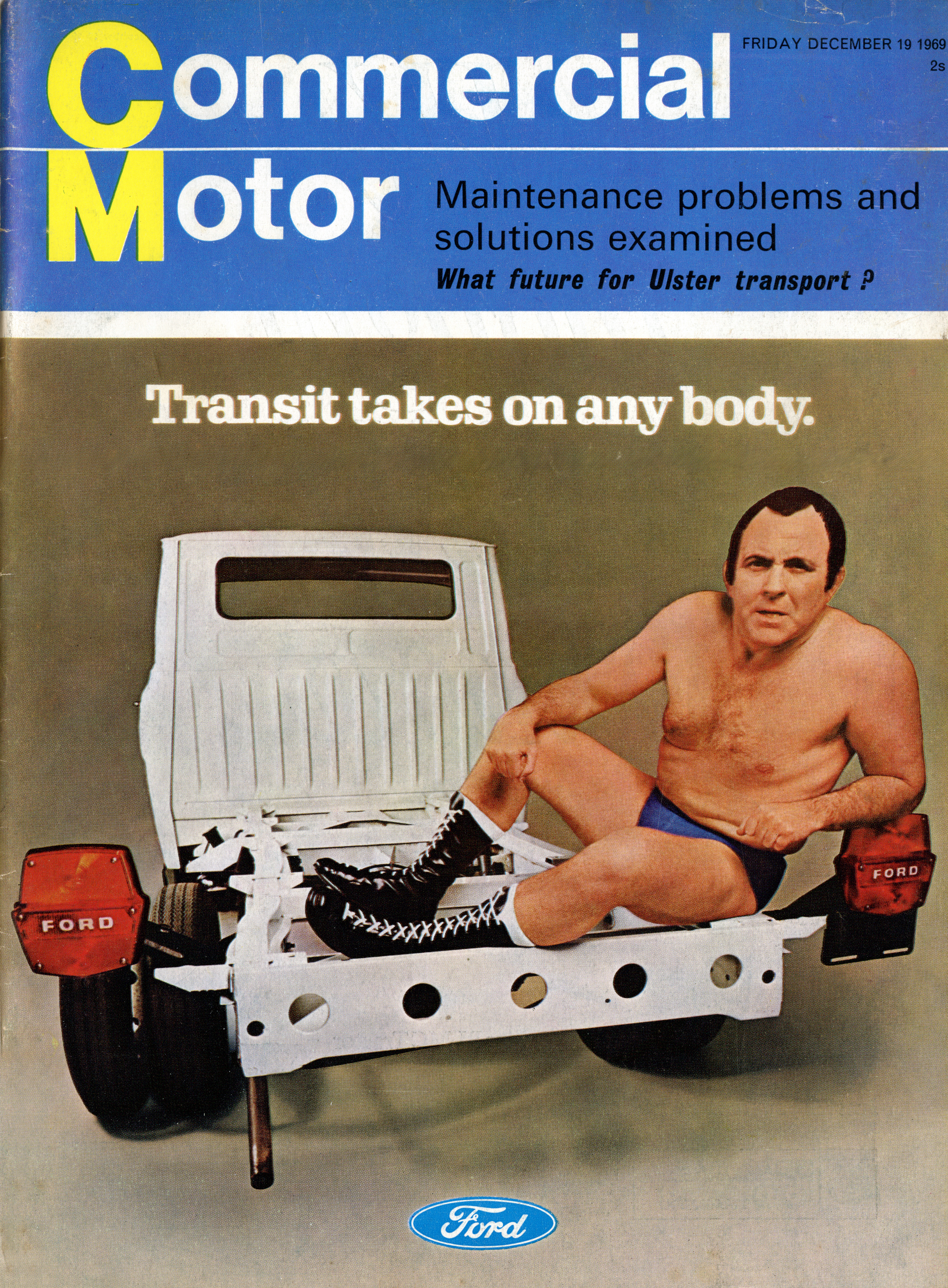Ebben az 1969-es reklámban a brit birkózóbajnok, Mick McManus mutatja be, hogy a cégek milyen sokoldalúan alakíthatják át a saját céljaikra a Transit önjáró alvázas változatát.