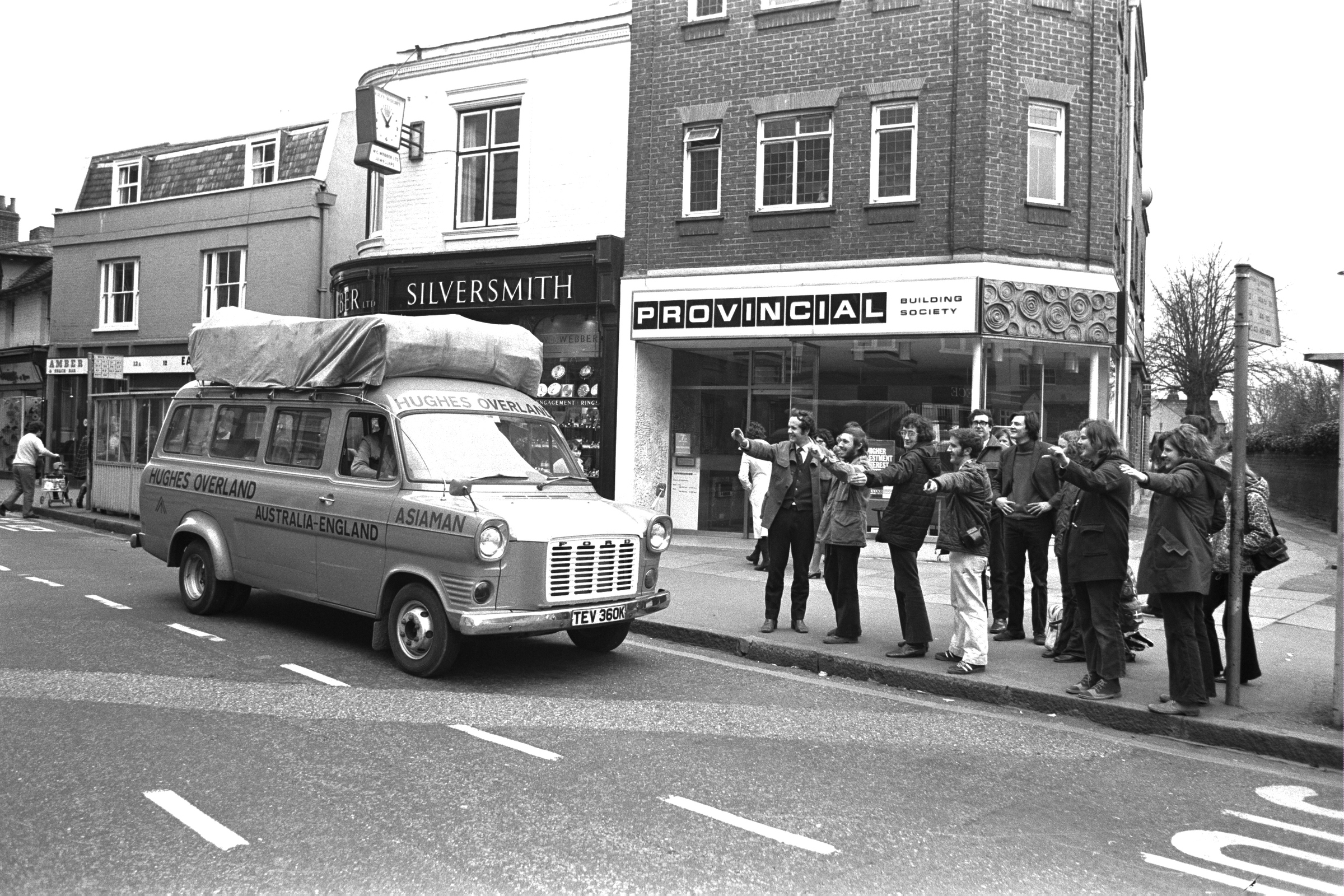 A Hughes Overland Tours járműve lehúzódik egy buszmegállóban, hogy újabb utasokat vegyen fel az Angliából Ausztráliába tartó, 10 hetes, 16 ezer kilométeres Transit-busztúrára 1973-ban.