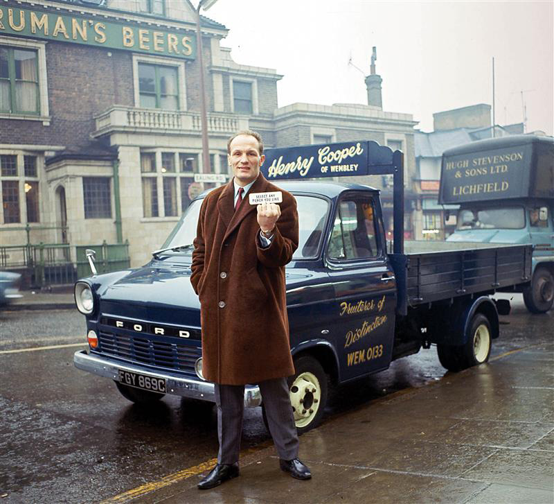 A brit bokszlegenda, Sir Henry Cooper a ’60-as években még családja zöldségesboltjában dolgozott; ezen a képen Ford Transit pickupjukkal látható.