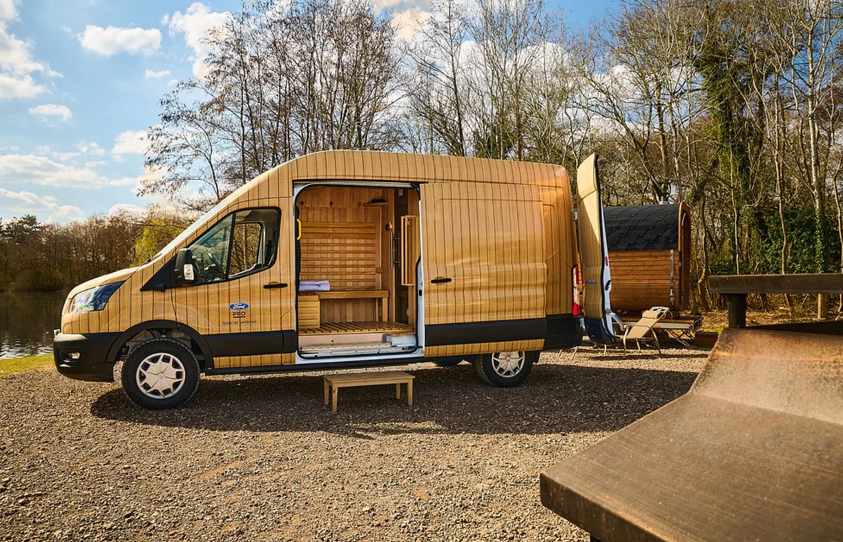 A Ford Pro Speciális Járművek részlege néha elég szokatlan megbízásokat kap, és ezek közül is az egyik legmeglepőbb az volt, amikor mobil szaunává kellett átépíteniük egy autót. A feladatot az E-Transit meghajtó akkumulátorának felhasználásával oldották meg, ráadásul nemcsak a belső teret burkolták fával, hanem még a karosszéria külső felületét is fahatású fóliával dekorálták.