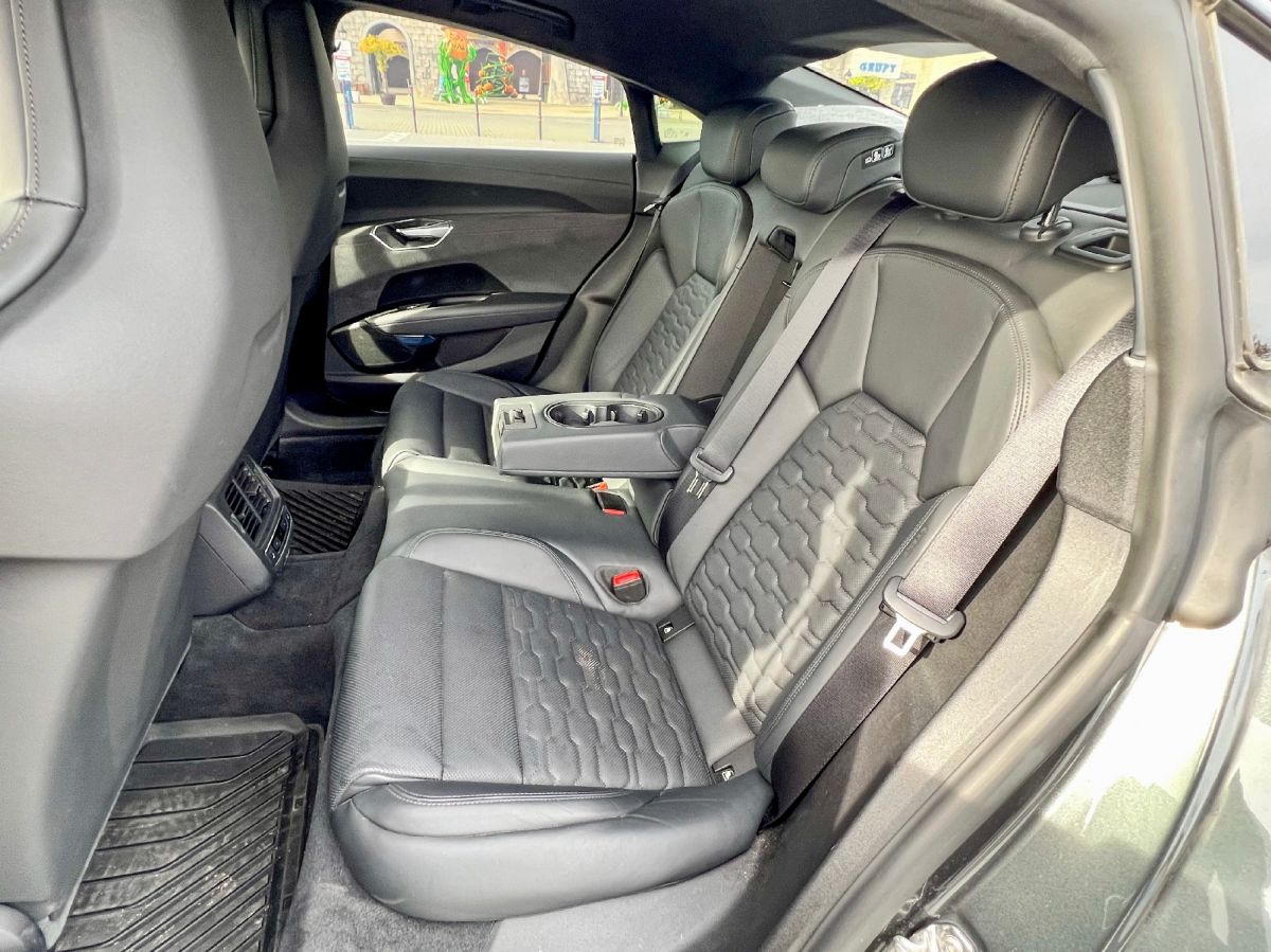Az egyik ilyen szempont a forma. Nehéz szavakkal leírni, hogy mennyire egyben van ez az autó. Hosszú percekig lehet csodálni minden egyes pontját. A különleges, fekete betétes hűtőmaszkot, a légbeömlőt az első kerékjáratnál, vagy legfőképpen a hátsó ajtónál azt a kiszélesítést, amelytől annyira dög lesz az Audi, hogy bekönnyezik az ember szeme. Egyáltalán nem az elektromos autózás által hajtott konstrukciós megoldás hajtotta valószínű a tervezőket, hogy 305/30 r21-es kerekek kerüljenek hátra, de ezt a látvány miatt szerintem mindenki megbocsájtja. Gyönyörűséges a hátsó tetőív, amely egyébként egyáltalán nem pici, 405 literes csomagteret rejt maga alatt, de persze a nyílás nem mondható nagynak, ahonnan ez elérhető.