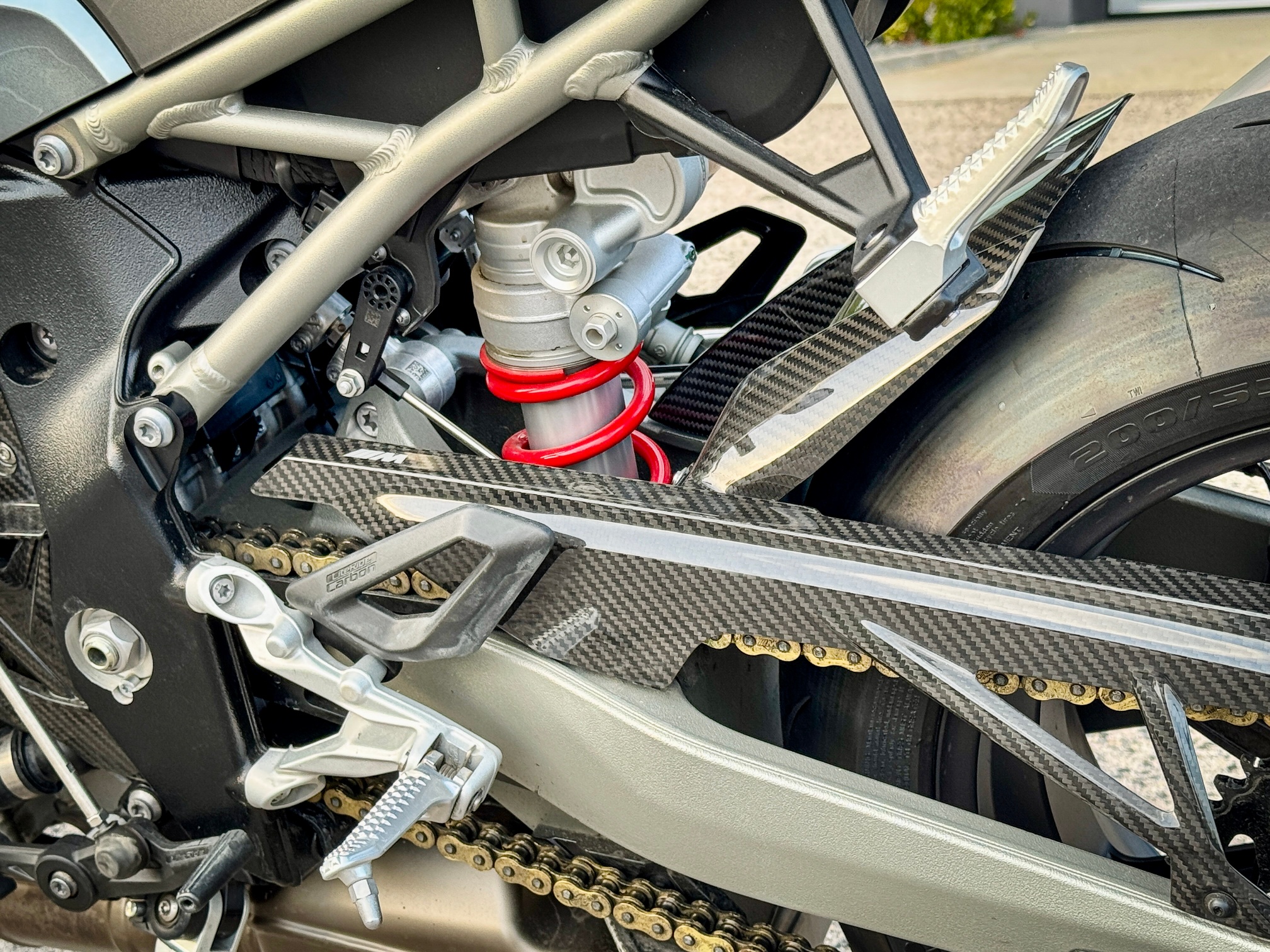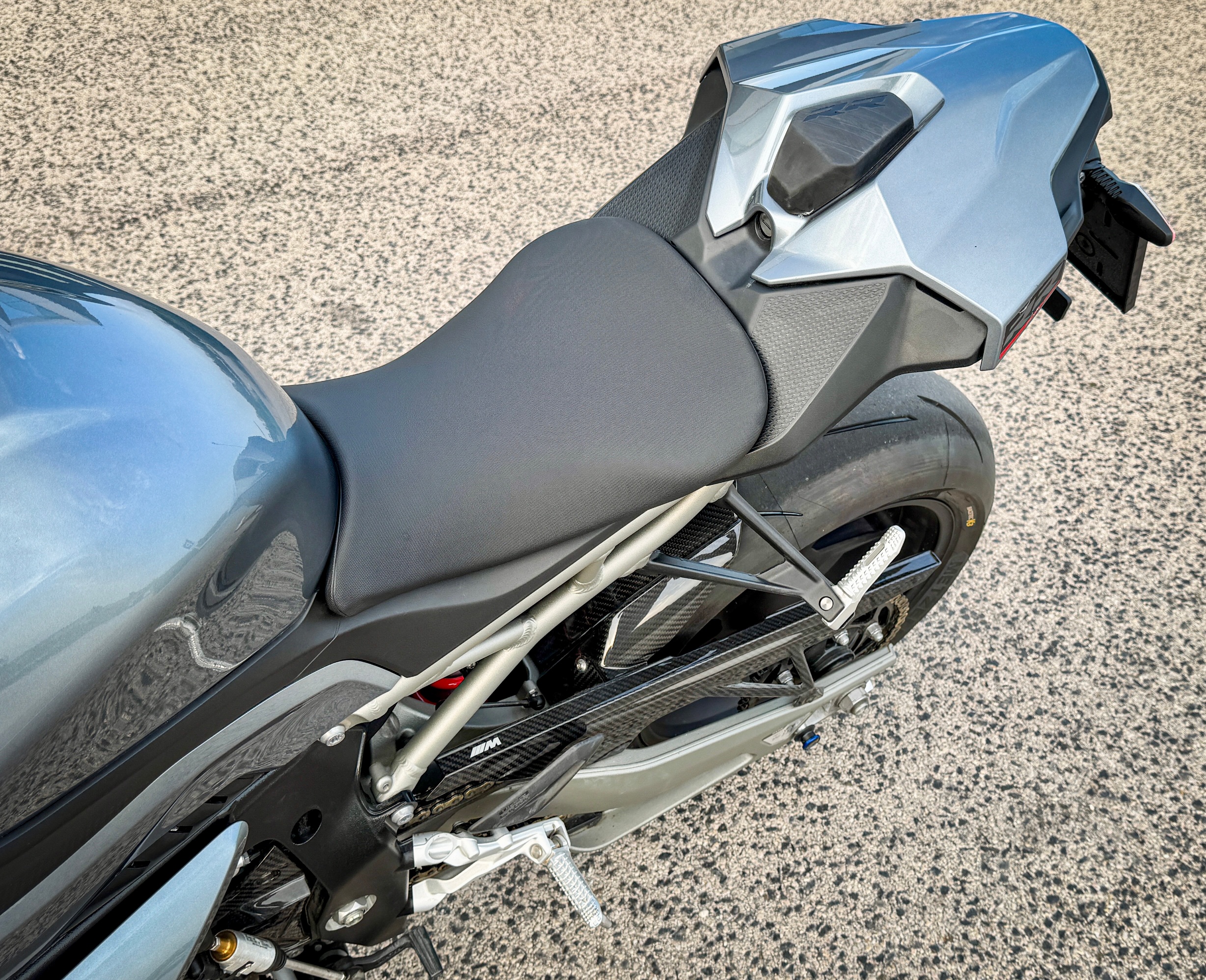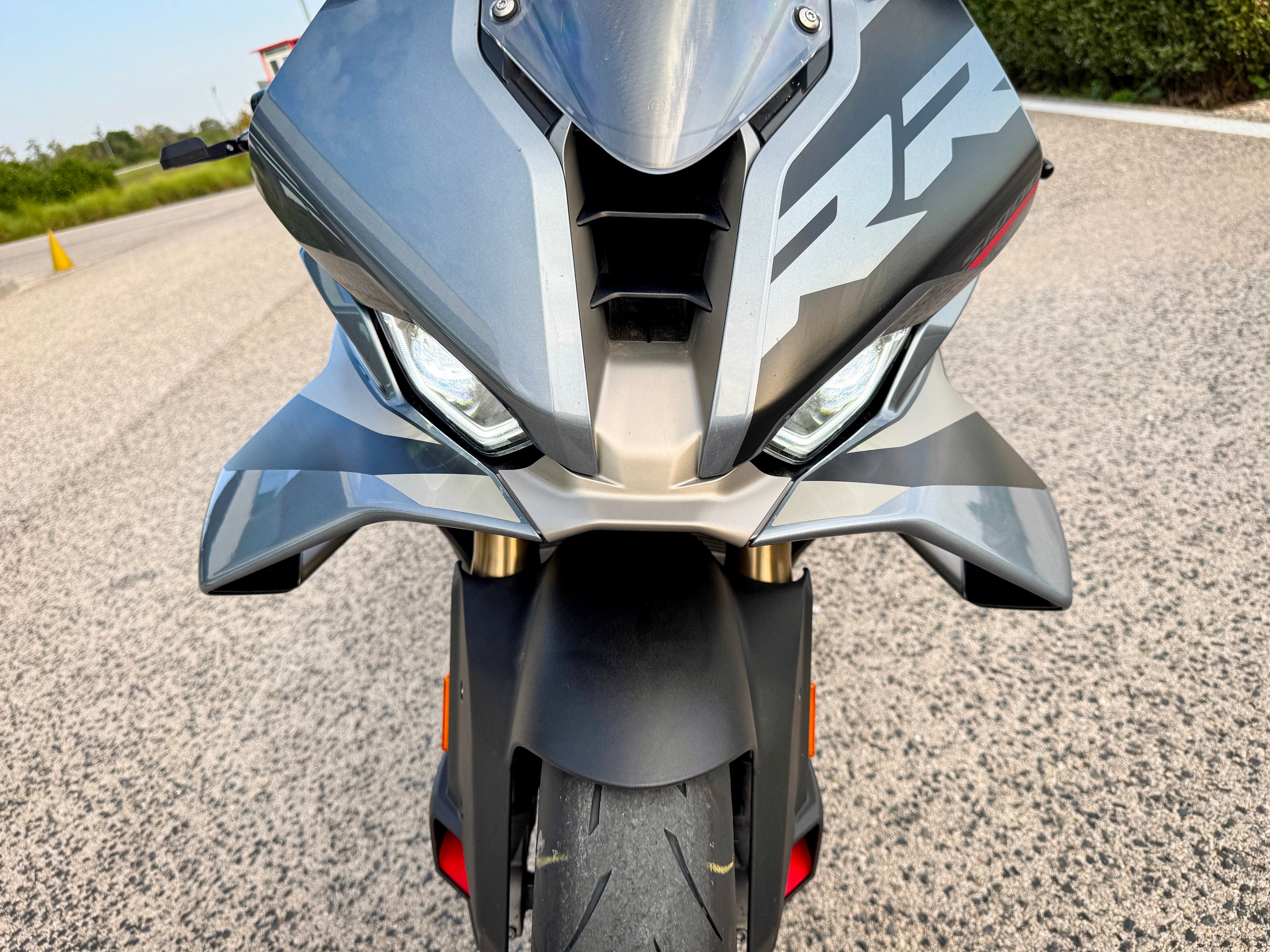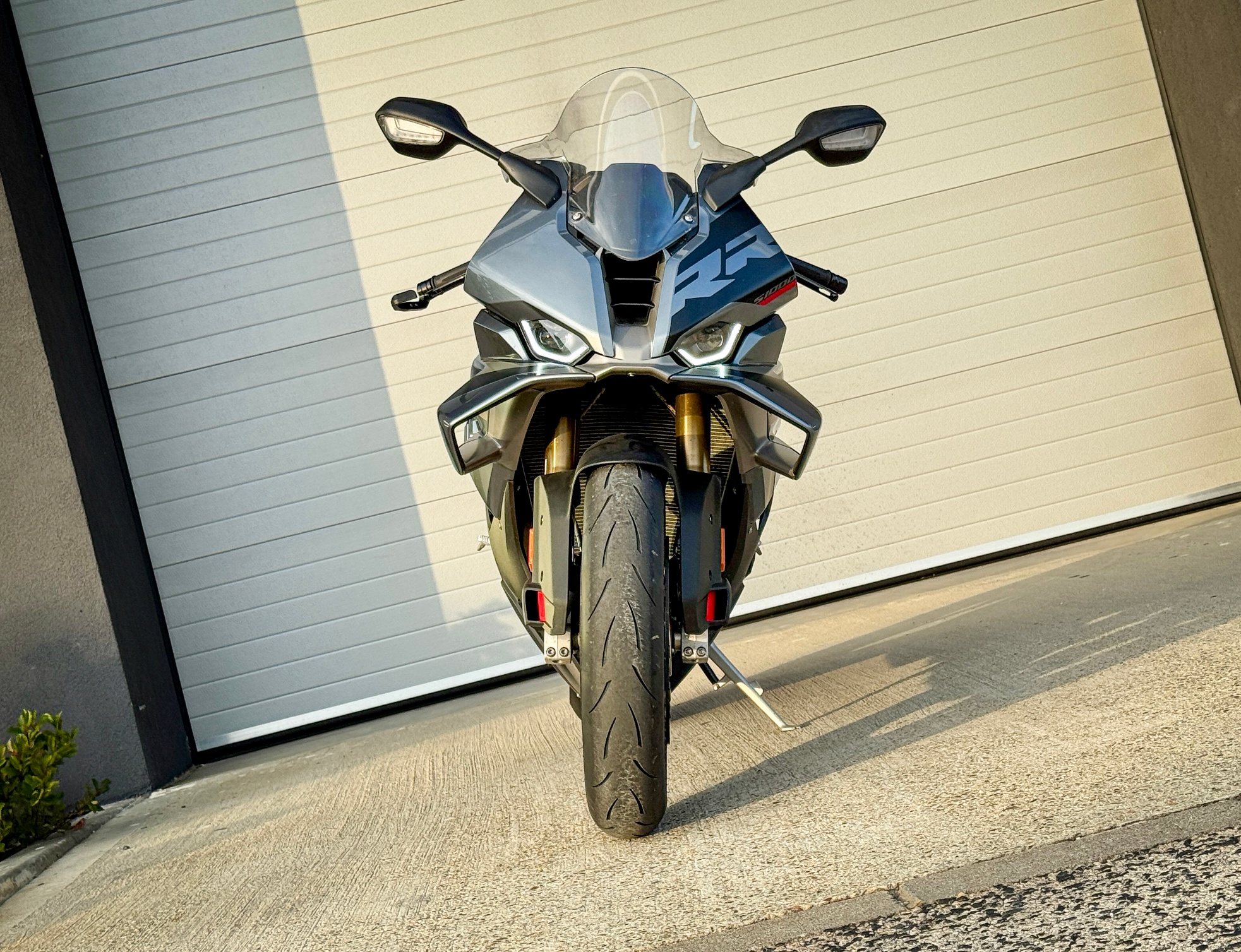 A motor első pillantásra szemből olyan, mintha fel akarna falni mindent, ami elé kerül. A teljesen áttervezett fejidom, a mélyre húzott, éles vonalak és a LED-es fényszórók agresszív tekintete egyfajta ragadozóra utaló sziluettet hoz létre. A szárnyak, amelyek immár alapfelszereltség részei, nemcsak a funkcionalitást szolgálják, hanem a motor arcberendezésének részévé válnak, mintha a filmbéli Predator állkapcsa nyílna ki. Ez a vizuális agresszió nem véletlen tökéletesen tükrözi a motor karakterét és azt a célt, amire tervezték: a sebességet, a precizitást és a versenypálya uralását.
