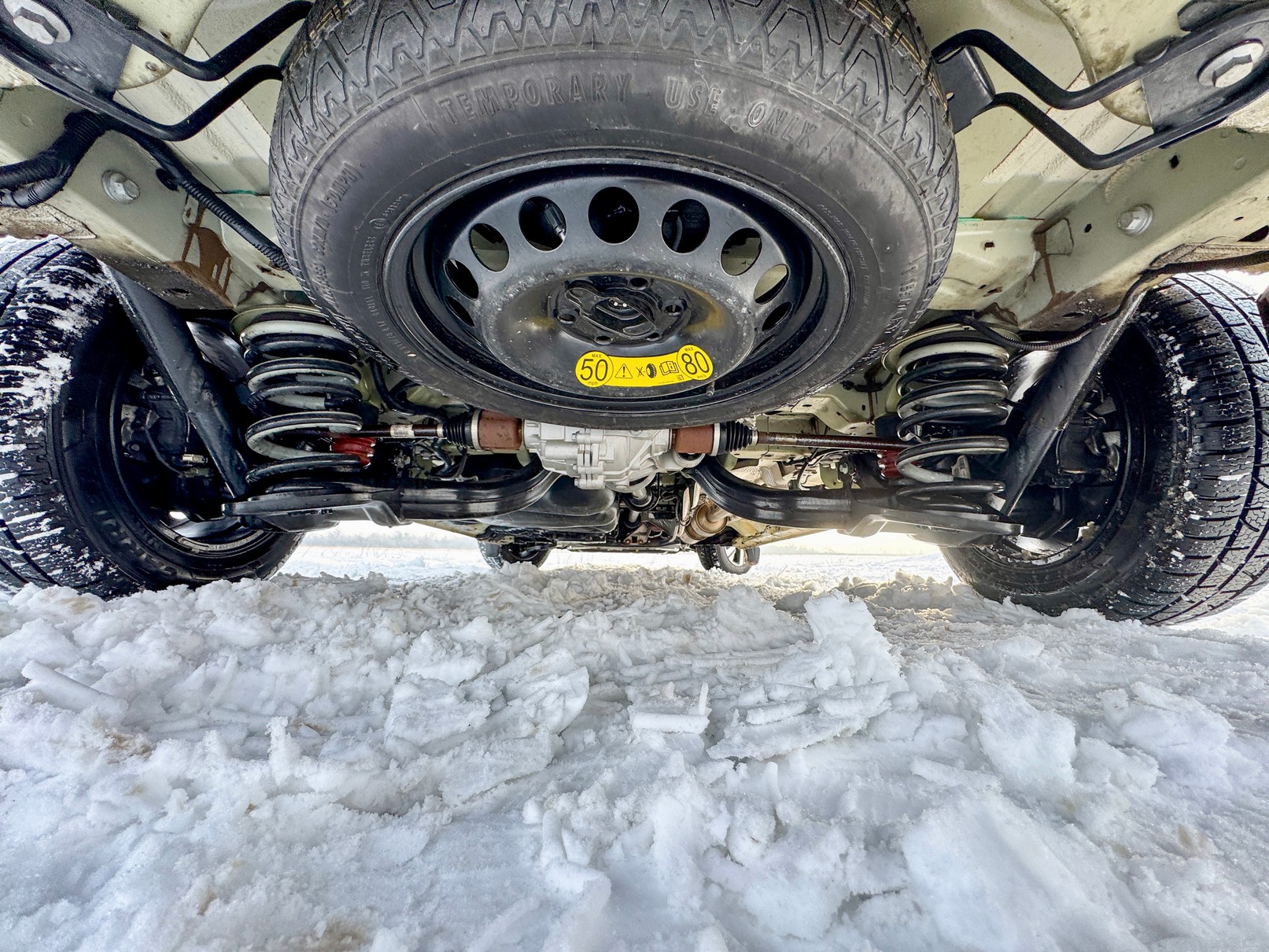 Az alvázat szemügyre véve látszik a mérnöki gondosság: a futómű stabil és strapabíró. Külön megnyugtató, hogy a technika ellenére maradt hely a teljes értékű pótkeréknek az alvázon – egy "téli melósnál" ez nem opció, hanem alapfeltétel, hiszen egy távoli munkaterületen a defektjavító készlet nem megoldás.