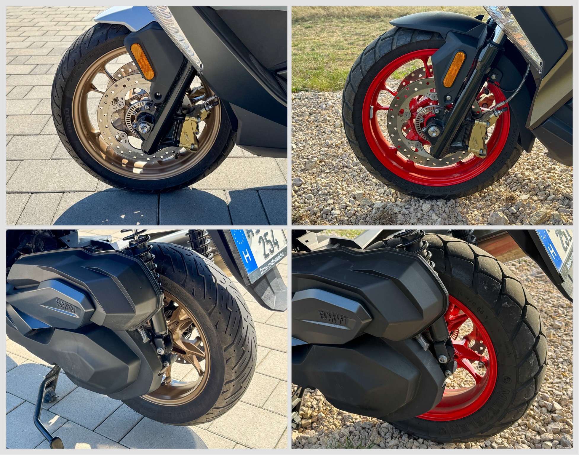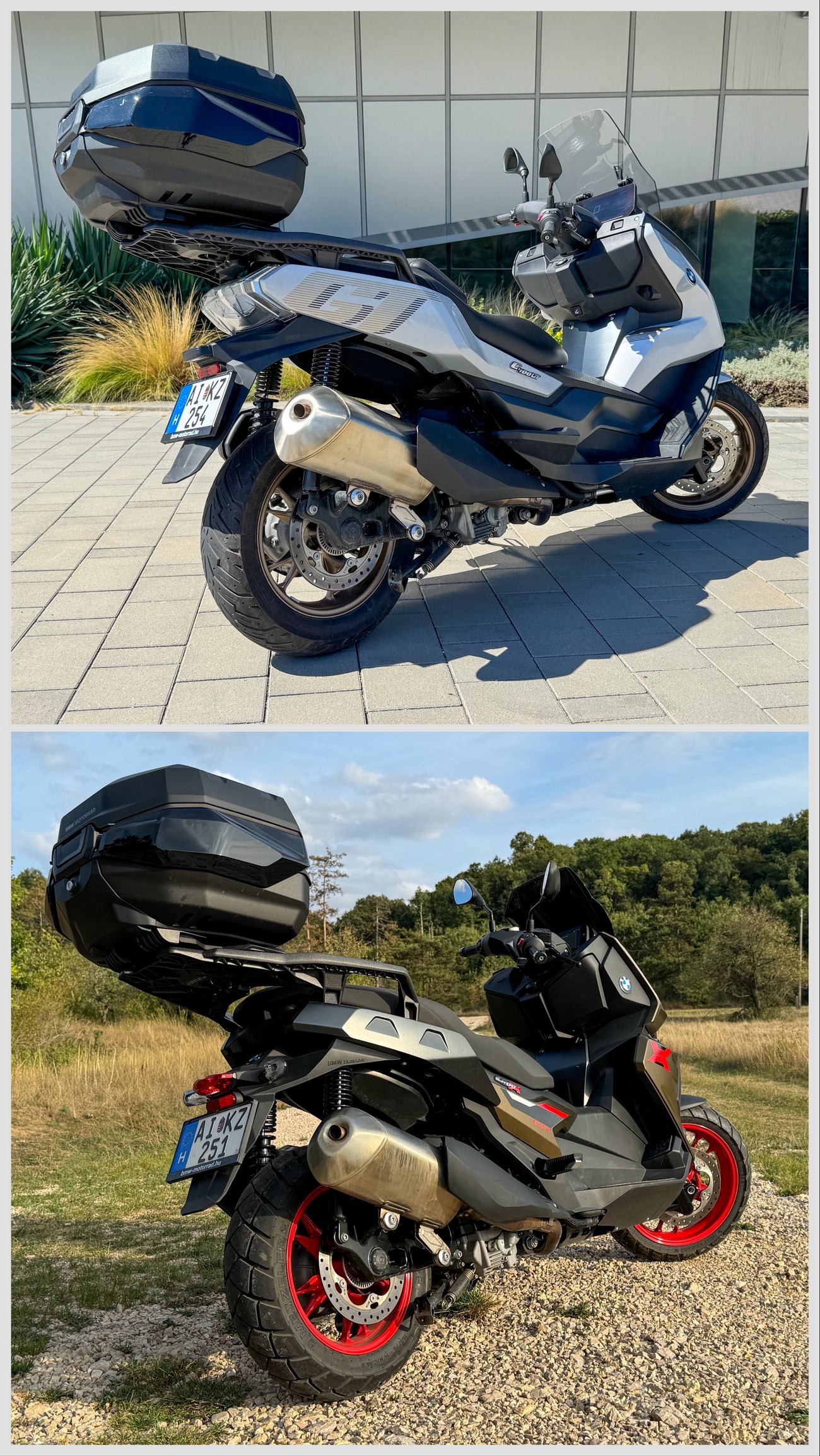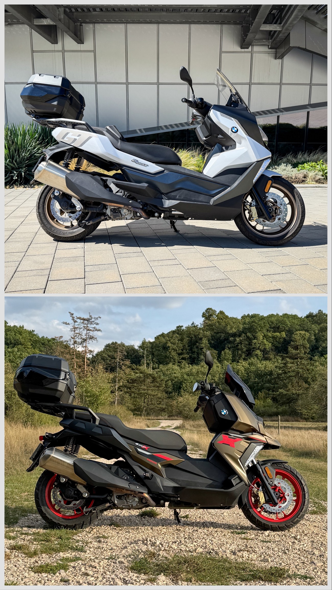 Ezzel szemben a BMW C400X Rugged megjelenése a BMW GS kalandmotorok stílusjegyeit idézi. A matt Kalamata metálfény, a robusztusabb kialakítású burkolatok és a terepmintás abroncsok is egyértelműen a kalandokra utalnak. A kisebb, sötétített szélvédő és az aktívabb, előre dőlt ülőpozíció jobban illik a városi forgalomhoz és a földutakhoz. Míg a C400GT a kényelmet helyezi előtérbe, a C400X Rugged a dinamikus, "mindenre kész" attitűdöt képviseli, amely nem riad vissza a járatlan utaktól sem.